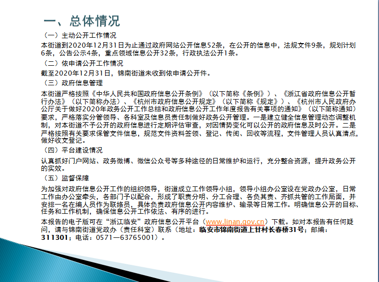 本報告的電子版可在“浙江臨安”政府信息公開平臺(www.gztsgg.com)下載。如對本報告有任何疑問,請與錦南街道黨政辦(責任科室)聯系(地址:臨安市錦南街道上甘村長春橋31號;郵編:311301;電話:0571—63765001)。