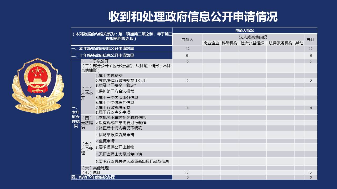 ? ? 2020年度,我局共計收到政府信息公開申請12起,其中郵寄申請5起,政府信息平臺申請7起,申請內容分別是接處警信息、戶籍信息、案卷材料等。對以上政府信息,我局均由法制部門受理并答復,確保政府信息公開案件得以規范辦理,確保政府信息公開申請辦結率100%。