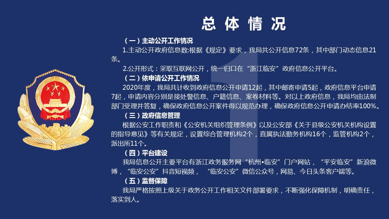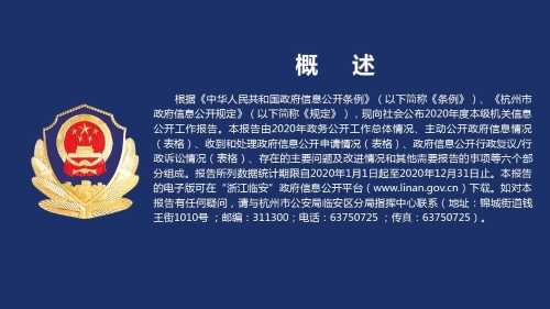 ? ? ? 根據《中華人民共和國政府信息公開條例》(以下簡稱《條例》)、《杭州市政府信息公開規定》(以下簡稱《規定》),現向社會公布2020年度本級機關信息公開工作報告。本報告由2020年政務公開工作總體情況、主動公開政府信息情況(表格)、收到和處理政府信息公開申請情況(表格)、政府信息公開行政復議/行政訴訟情況(表格)、存在的主要問題及改進情況和其他需要報告的事項等六個部分組成。報告所列數據統計期限自2020年1月1日起至2020年12月31日止。本報告的電子版可在“浙江臨安”政府信息公開平臺(www.gztsgg.com)下載。如對本報告有任何疑問,請與杭州市公安局臨安區分局指揮中心聯系(地址:錦城街道錢王街1010號 ;郵編:311300;電話:63750725 ;傳真:63750725)。