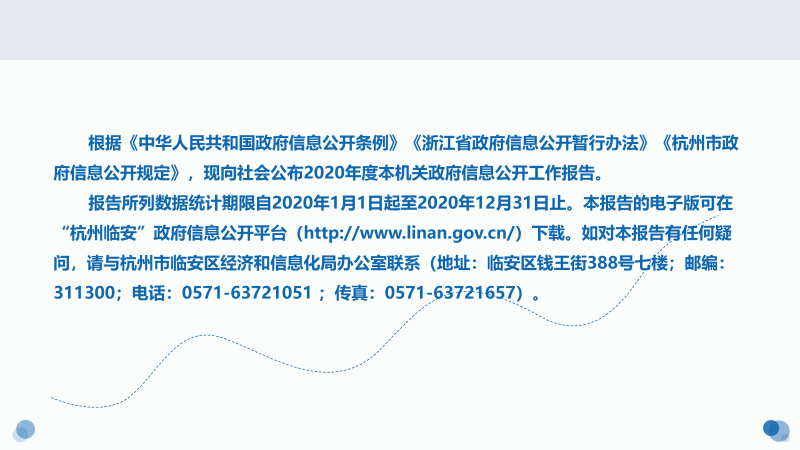 報(bào)告所列數(shù)據(jù)統(tǒng)計(jì)期限自2020年1月1日起至2020年12月31日止。本報(bào)告的電子版可在“杭州臨安”政府信息公開(kāi)平臺(tái)(http://www.gztsgg.com/)下載。如對(duì)本報(bào)告有任何疑問(wèn),請(qǐng)與杭州市臨安區(qū)經(jīng)濟(jì)和信息化局辦公室聯(lián)系(地址:臨安區(qū)錢(qián)王街388號(hào)七樓;郵編:311300;電話:0571-63721051 ;傳真:0571-63721657)。