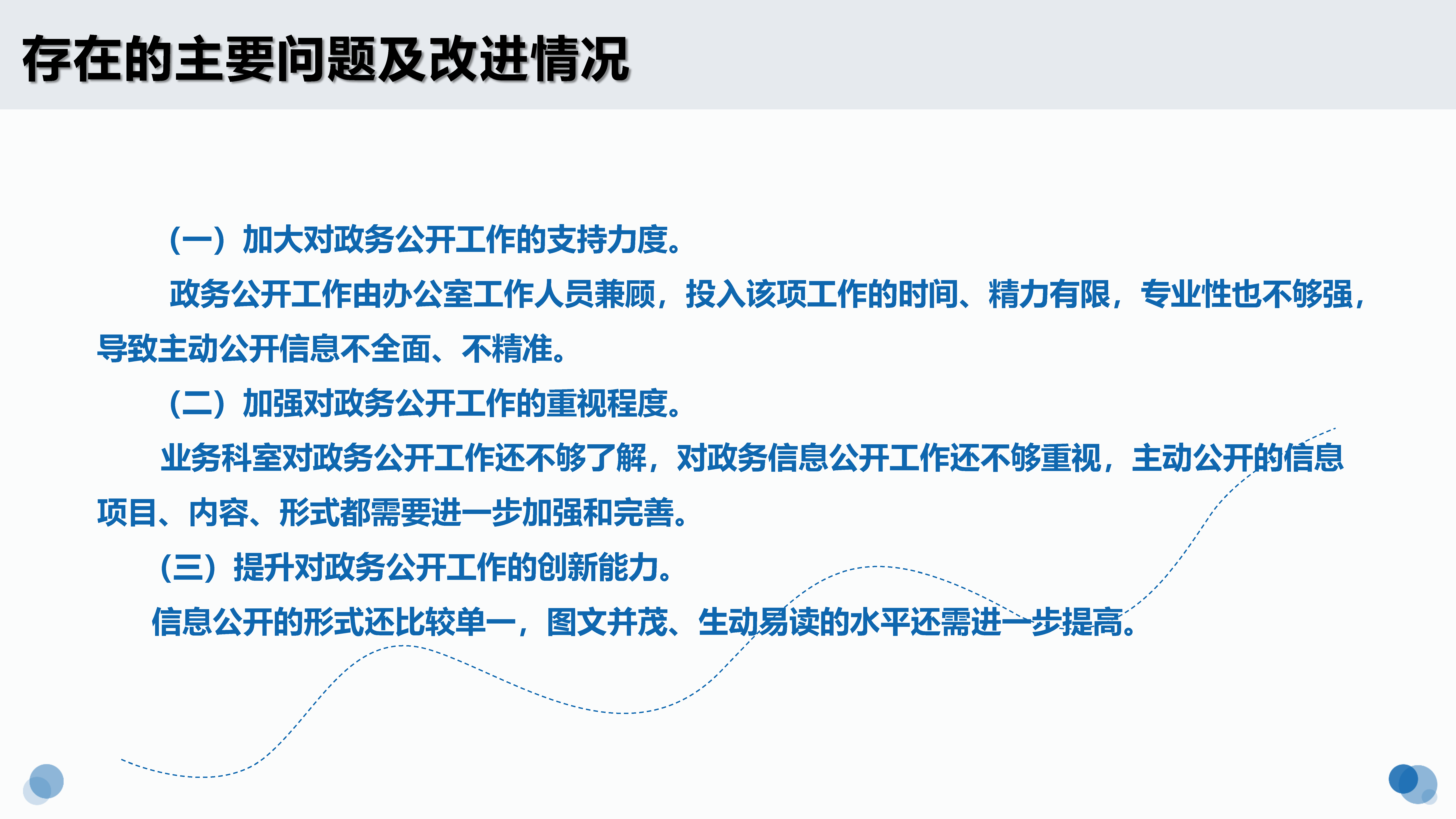 業(yè)務(wù)科室對(duì)政務(wù)公開(kāi)工作還不夠了解,對(duì)政務(wù)信息公開(kāi)工作還不夠重視,主動(dòng)公開(kāi)的信息項(xiàng)目、內(nèi)容、形式都需要進(jìn)一步加強(qiáng)和完善。