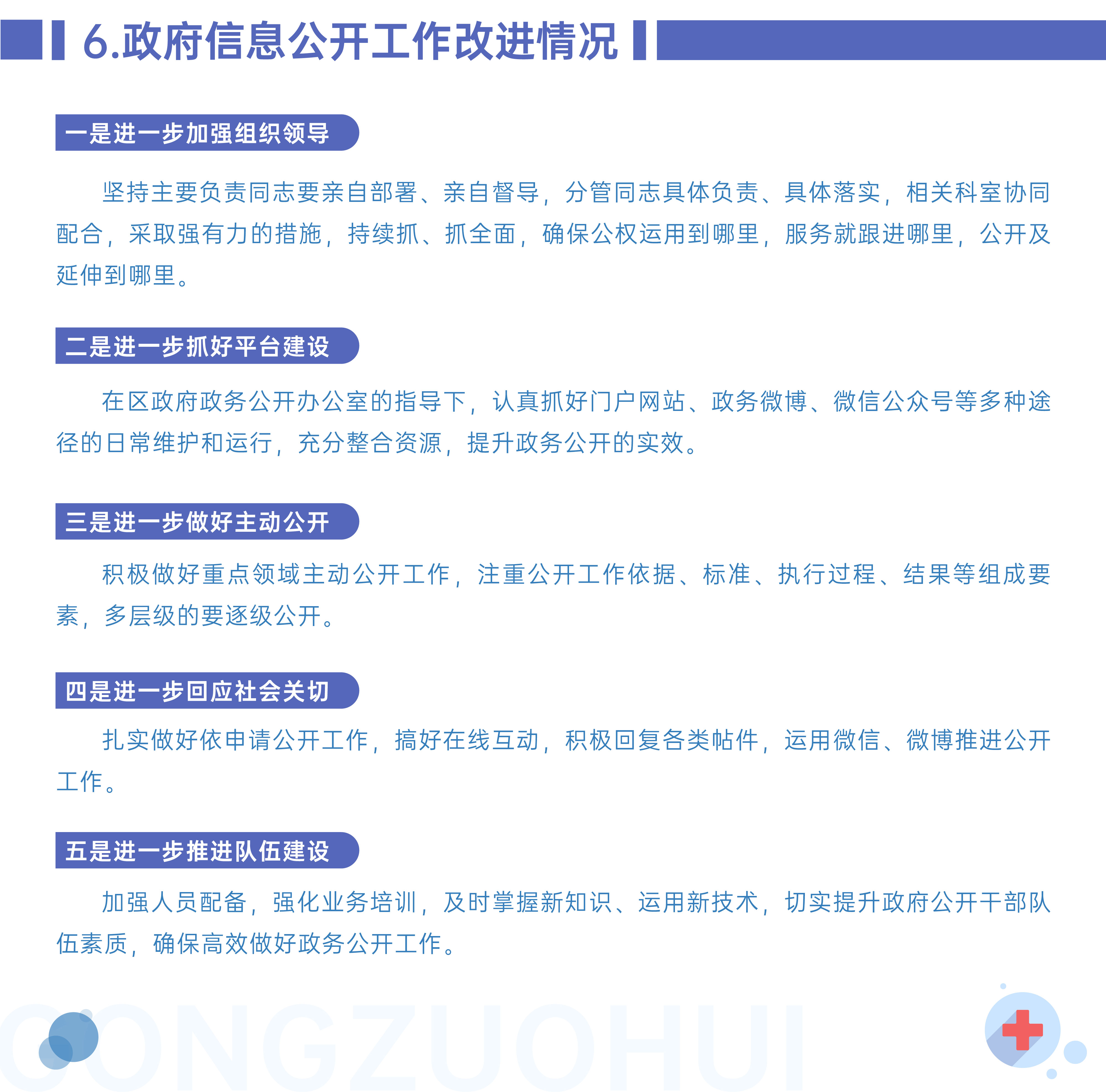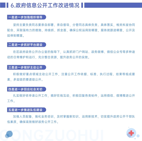 五是進一步推進隊伍建設。加強人員配備,強化業務培訓,及時掌握新知識、運用新技術,切實提升政府公開干部隊伍素質,確保高效做好政務公開工作。
