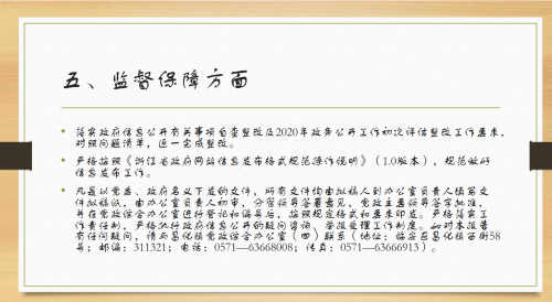 落實政府信息公開有關事項自查整改及2020年政務公開工作初次評估整改工作要求,對照問題清單,逐一完成整改。嚴格按照《浙江省政府網站信息發布格式規范操作說明》(1.0版本),規范做好信息發布工作。凡是以黨委、政府名義下發的文件,所有文件均由擬稿人到辦公室負責人填寫文件擬稿紙,由辦公室負責人初審,分管領導簽署意見,黨政主要領導簽字批準,并在黨政綜合辦公室進行登記和編號后,按照規定格式和要求印發。嚴格落實工作責任制,嚴格執行政府信息公開的疑問咨詢、舉報受理工作制度。如對本報告有任何疑問,請與昌化鎮黨政綜合辦公室(四)聯系(地址:臨安區昌化鎮西街58號;郵編:311321;電話:0571—63668008;傳真:0571—63666913)。