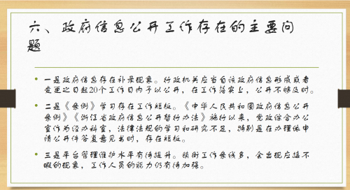 2020年,我鎮的政務公開工作在原有基礎上有了一定的提升,但與上級部門、鎮黨委政府的要求還存在差距,主要表現在:一是政府信息存在補錄現象。行政機關應當自該政府信息形成或者變更之日起20個工作日內予以公開,在工作落實上,公開不夠及時。二是《條例》學習存在工作短板。《中華人民共和國政府信息公開條例》《浙江省政府信息公開暫行辦法》施行以來,黨政綜合辦公室作為經辦科室,法律法規的學習和研究不足,特別是在辦理依申請公開件答復意見書時,存在盲點。三是平臺管理維護水平有待提升。鎮街工作條線多,會出現應接不暇的現象,工作人員的能力仍有待加強。