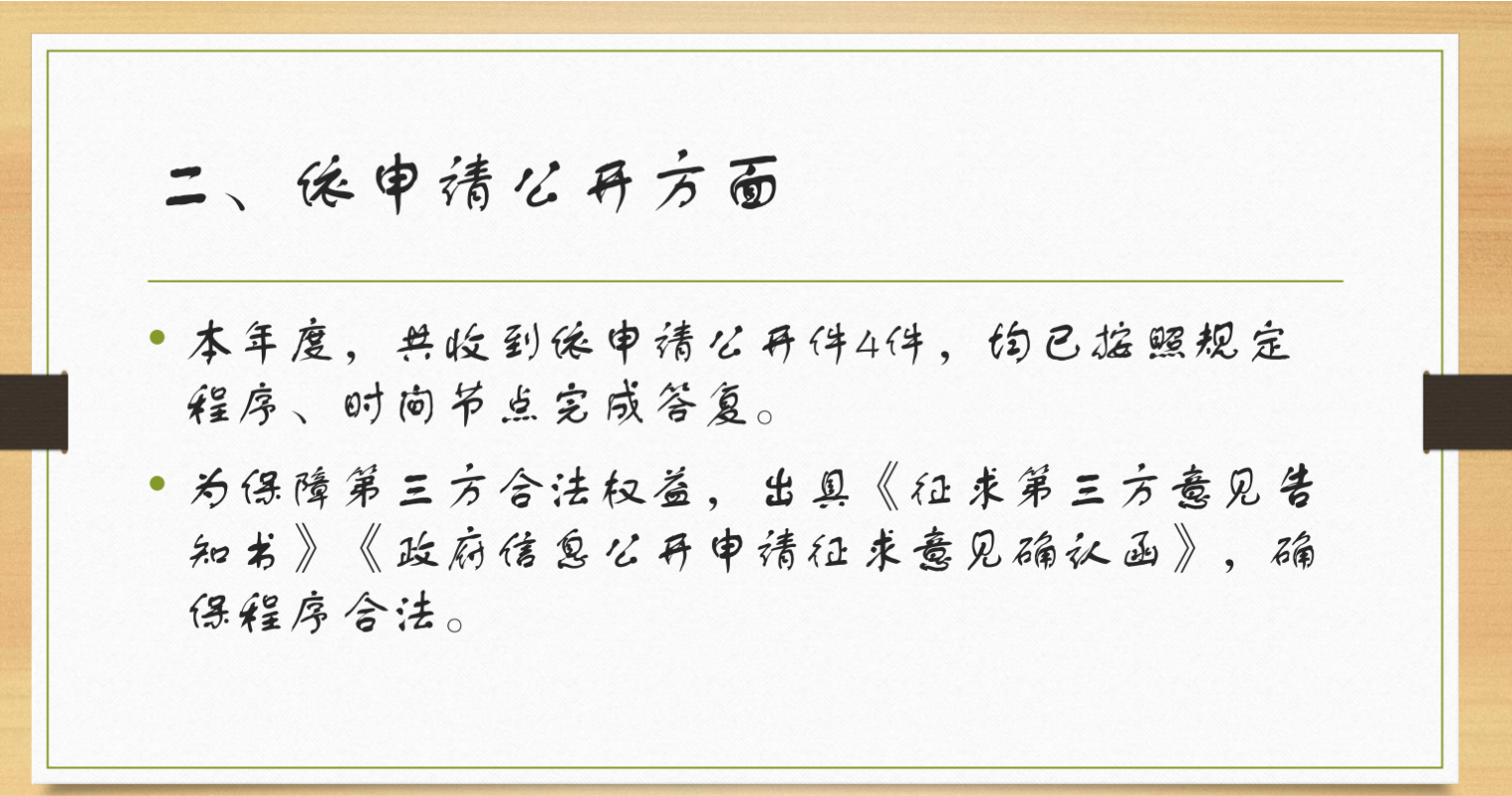 一年來,共收到依申請公開件4件,均已按照規定程序、時間節點完成答復。為保障第三方合法權益,出具《征求第三方意見告知書》《政府信息公開申請征求意見確認函》,確保程序合法。