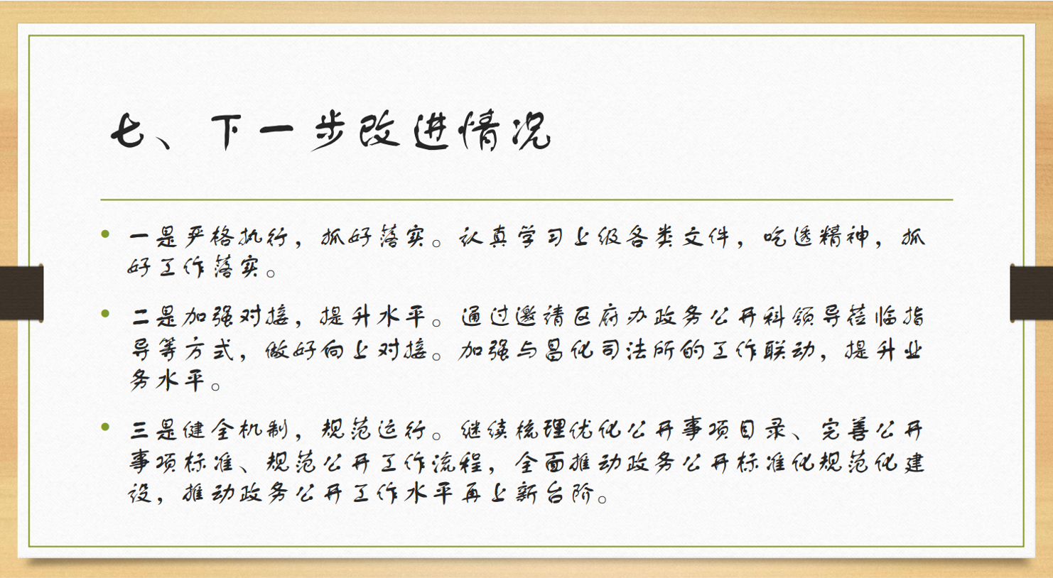 2021年,在鞏固現有工作成績的基礎上,昌化鎮將持續推進政務公開標準化規范化建設,進一步推動政務公開工作不斷向縱深發展。一是嚴格執行,抓好落實。認真學習上級各類文件,吃透精神,抓好工作落實。二是加強對接,提升水平。通過邀請區府辦政務公開科領導蒞臨指導等方式,做好向上對接。加強與昌化司法所的工作聯動,提升業務水平。三是健全機制,規范運行。繼續梳理優化公開事項目錄、完善公開事項標準、規范公開工作流程,全面推動政務公開標準化規范化建設,優化工作流程,推動政務公開工作水平再上新臺階。