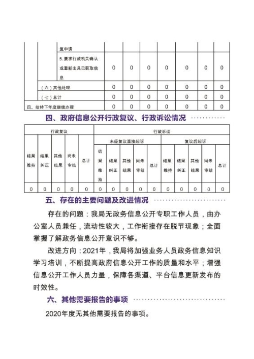 改進方向:2021年,我局將加強業務人員政務信息知識學習培訓,不斷提高政府信息公開工作的質量和水平;增強信息公開工作人員力量,保障各渠道、平臺信息更新發布的時效性。
