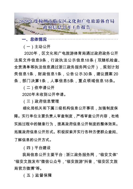 ?2020年,區文化和廣電旅游體育局通過政府政務公開法規文件信息9條,行政執法公示信息18條(雙隨機檢查、權責清單等執法信息通過浙江政務服務網公開),規劃計劃類信息1條,財政信息1條,公告公示30條,建議提案20條,部門決算1條,人事信息5條,重點領域信息18條。