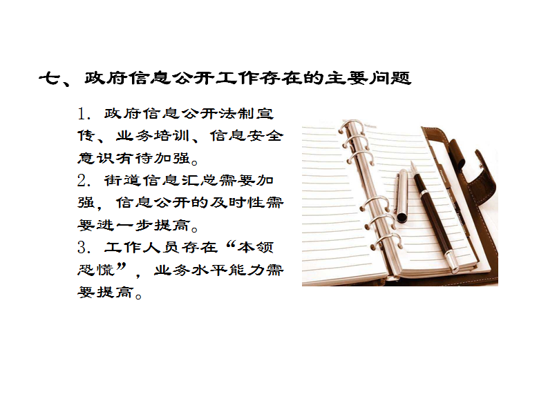 1. 政府信息公開法制宣傳、業務培訓、信息安全意識有待加強。