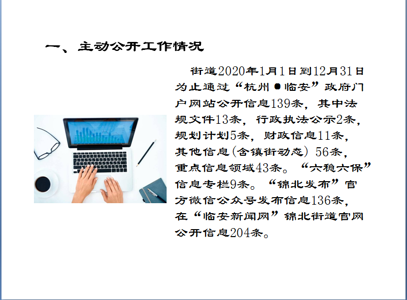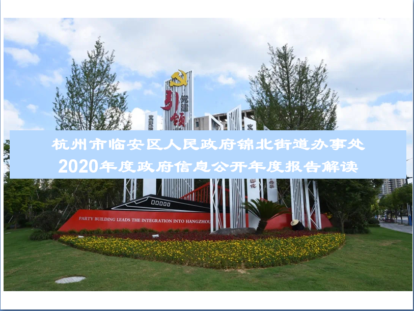 街道2020年1月1日到12月31日為止通過“杭州·臨安”政府門戶網站公開信息139條,其中法規文件13條,行政執法公示2條,規劃計劃5條,財政信息11條,其他信息(含鎮街動態) 56條,重點信息領域43條。“六穩、六?!毙畔?條?!板\北發布”官方微信公眾號發布信息136條,在“臨安新聞網”錦北街道官網公開信息204條。