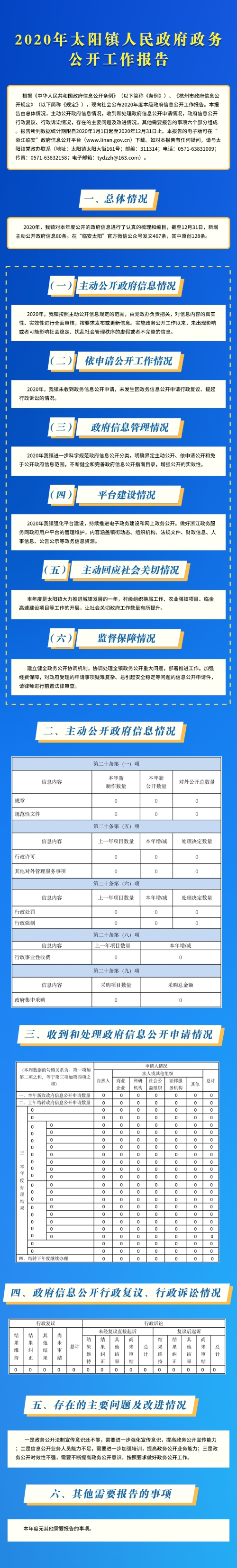 根據《中華人民共和國政府信息公開條例》(以下簡稱《條例》)、《杭州市政府信息公開規定》(以下簡稱《規定》),現向社會公布2020年度本級政府信息公開工作報告。本報告由總體情況,主動公開政府信息情況,收到和處理政府信息公開申請情況,政府信息公開行政復議、行政訴訟情況,存在的主要問題及改進情況,其他需要報告的事項六個部分組成。報告所列數據統計期限自2020年1月1日起至2020年12月31日止。本報告的電子版可在“浙江臨安”政府信息公開平臺(www.gztsgg.com)下載。如對本報告有任何疑問,請與太陽鎮黨政辦聯系(地址:太陽鎮太陽大街161號;郵編:311314;電話:0571-63831009;傳真:0571-63832158;電子郵箱:tydzzh@163.com)。