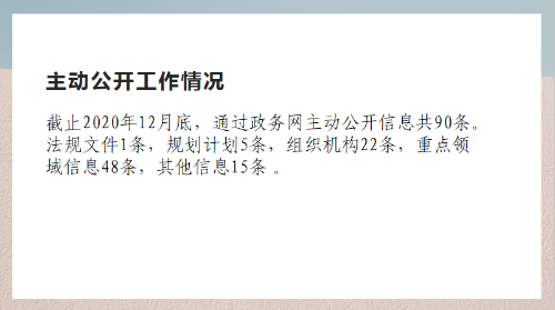2020年度,我鎮按照要求,結合自身實際,主要在機構職能、政策法規、公共服務等方面主動公開相關的政府信息。截至2020年12月底,通過政務網主動公開信息共90條,做到了信息公開形式多樣、內容豐富、信息準確。此外,還利用龍崗發布、臨安新聞網龍崗官網平臺及時發布政務信息。