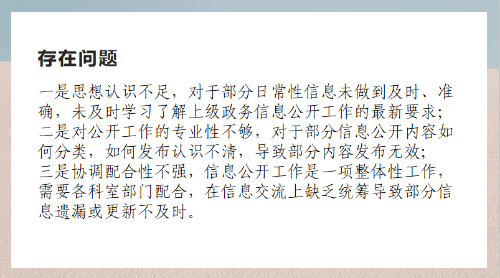?一是思想認識不足,對于部分日常性信息未做到及時、準確,未及時學習了解上級政務信息公開工作的最新要求;二是對公開工作的專業性不夠,對于部分信息公開內容如何分類,如何發布認識不清,導致部分內容發布無效;三是協調配合性不強,信息公開工作是一項整體性工作,需要各科室部門配合,在信息交流上缺乏統籌導致部分信息遺漏或更新不及時。