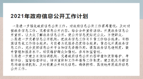 ?一是進一步強化政府信息公開工作,對政府信息公開工作要再重視,及時對接政務信息工作,完善信息公開內容,結合全年宣傳活動,開展政務信息公開宣傳,讓大眾了解政務信息公開,使公開信息更貼近公眾,方便群眾。