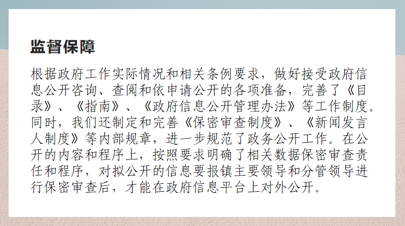 為確保政務公開工作依法有序的進行,建立健全政務公開工作規范制度,嚴格按照規定的步驟和程序辦事。根據政府工作實際情況和相關條例要求,做好接受政府信息公開咨詢、查閱和依申請公開的各項準備,完善了《目錄》、《指南》、《政府信息公開管理辦法》等工作制度。同時,我們還制定和完善《保密審查制度》、《新聞發言人制度》等內部規章,進一步規范了政務公開工作。在公開的內容和程序上,按照要求明確了相關數據保密審查責任和程序,對擬公開的信息要報鎮主要領導和分管領導進行保密審查后,才能在政府信息平臺上對外公開。