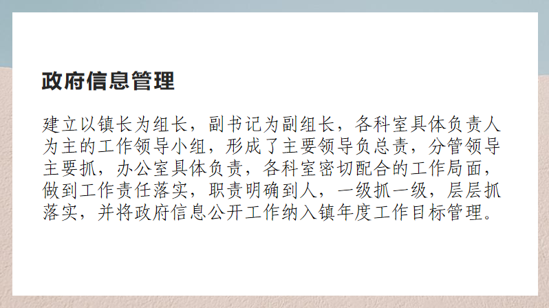 ?根據全區政務公開的統一部署和要求,我鎮及時把政務公開工作列入了重要議事日程,組織召開專題會議,傳達了全區政府信息公開工作會議精神,認真學習《中華人民共和國政府公開信息工作條例》和省、杭州市一系列關于做好政府信息公開工作的文件精神,明確了分管領導具體抓工作落實,建立了以鎮長為組長,副書記為副組長,各科室具體負責人為主的工作領導小組,形成了主要領導負總責,分管領導主要抓,辦公室具體負責,各科室密切配合的工作局面,做到工作責任落實,職責明確到人,一級抓一級,層層抓落實,并將政府信息公開工作納入鎮年度工作目標管理。