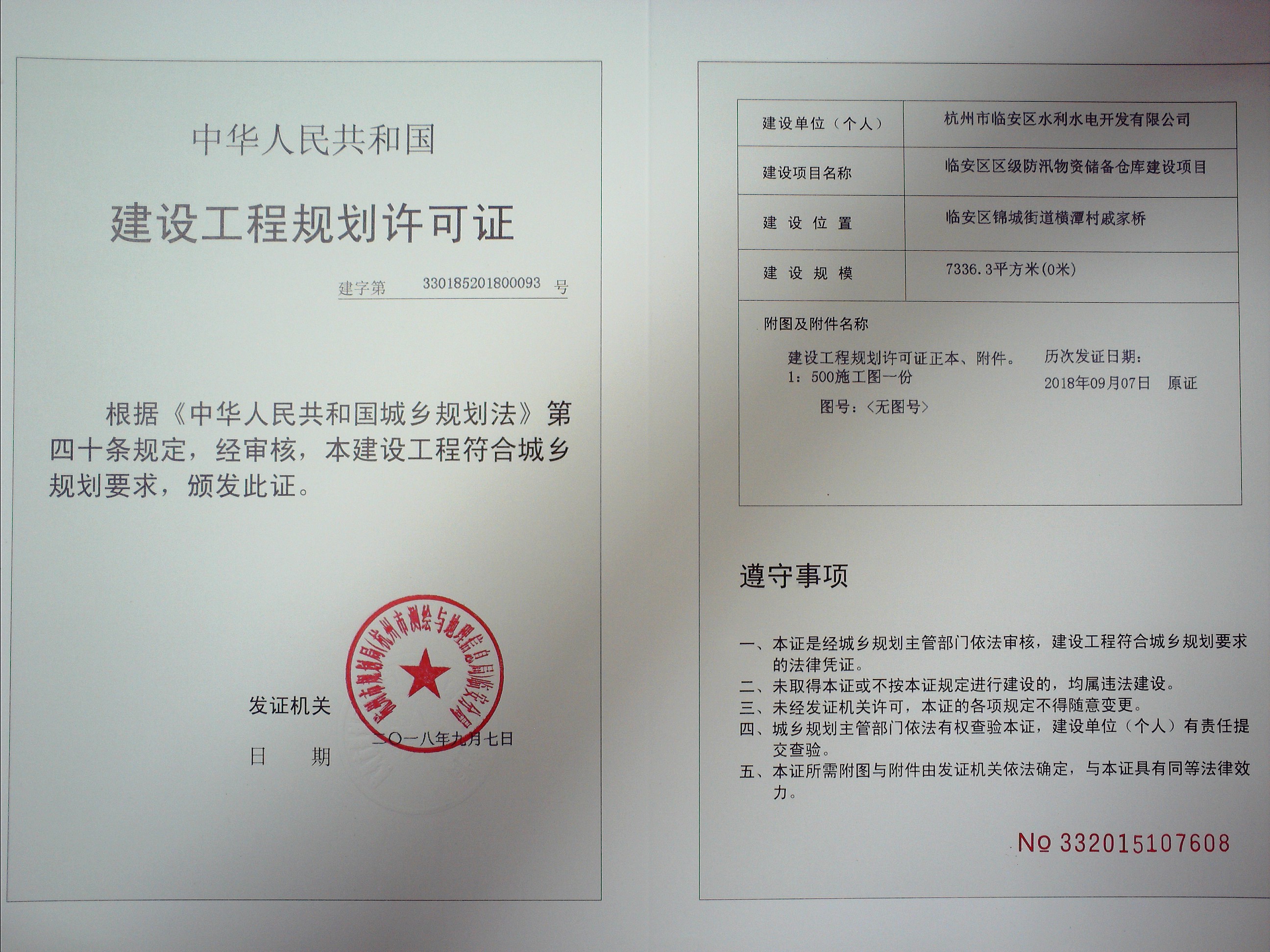 臨安區區級防汛物資儲備倉庫建設項目建設用地規劃許可審批結果