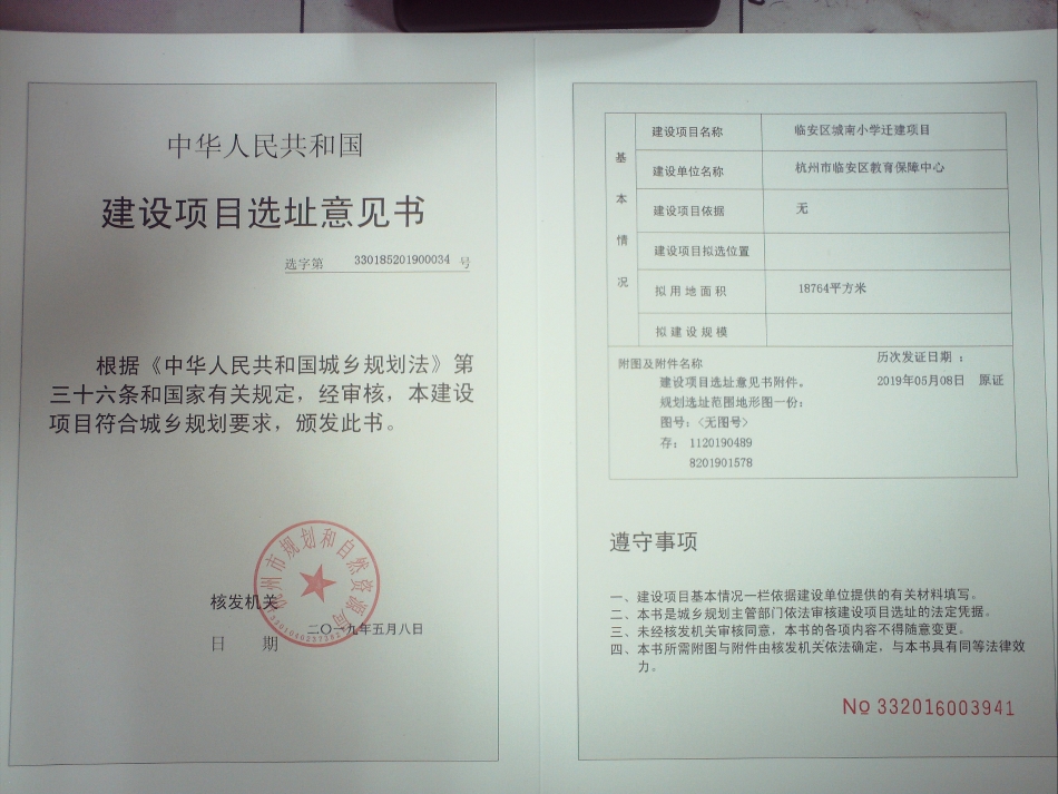 臨安區城南小學遷建項目建設用地規劃許可審批結果