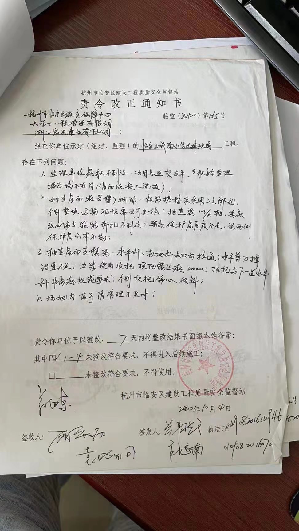 城南小學遷建項目責令改正通知書2020.10.4