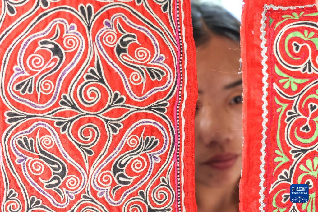 村民在貴州省黔西市新仁苗族鄉(xiāng)化屋村刺繡車(chē)間內(nèi)查看苗繡成品(2022年6月1日攝)。新華社記者 歐東衢 攝