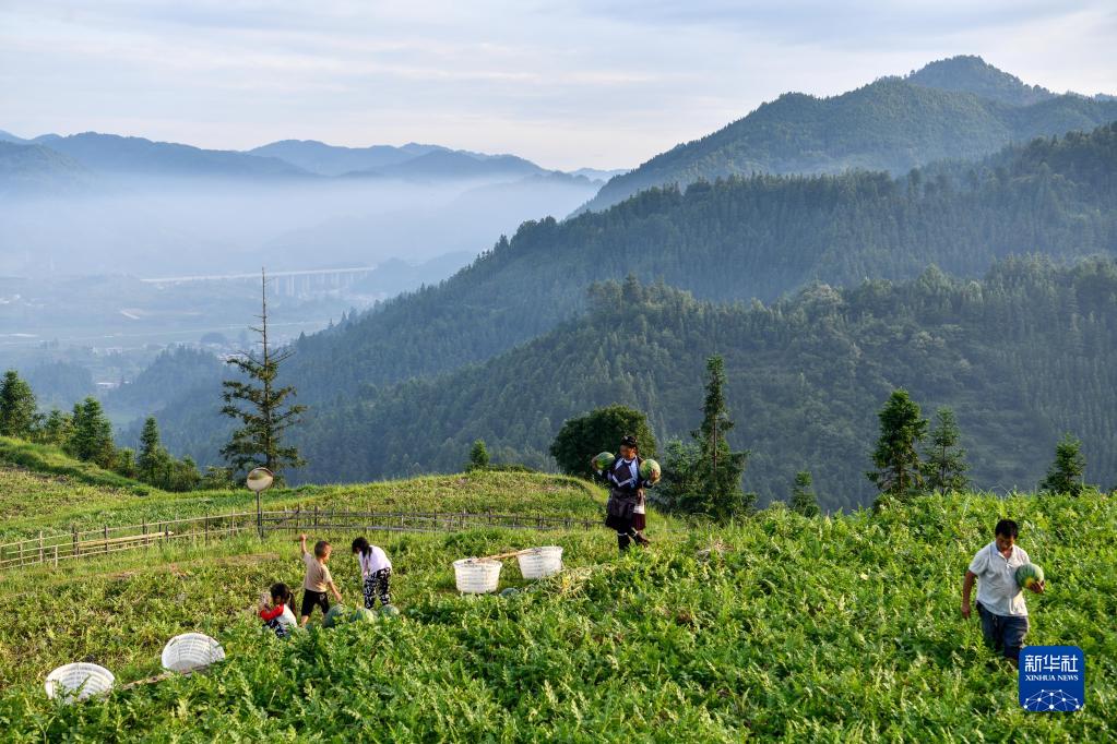 貴州省榕江縣忠誠(chéng)鎮(zhèn)苗本村的農(nóng)民在梯田上收獲西瓜(2022年7月16日攝)。新華社記者 楊文斌 攝