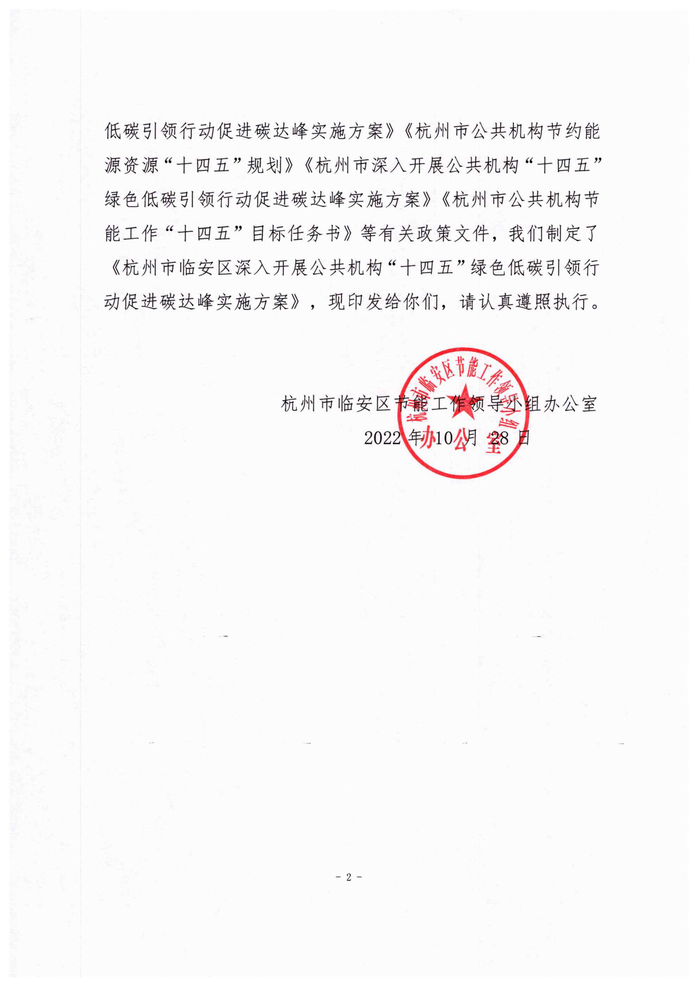 關于印發《杭州市臨安區深入開展公共機構“十四五”綠色低碳引領行動促進碳達峰實施方案》的通知