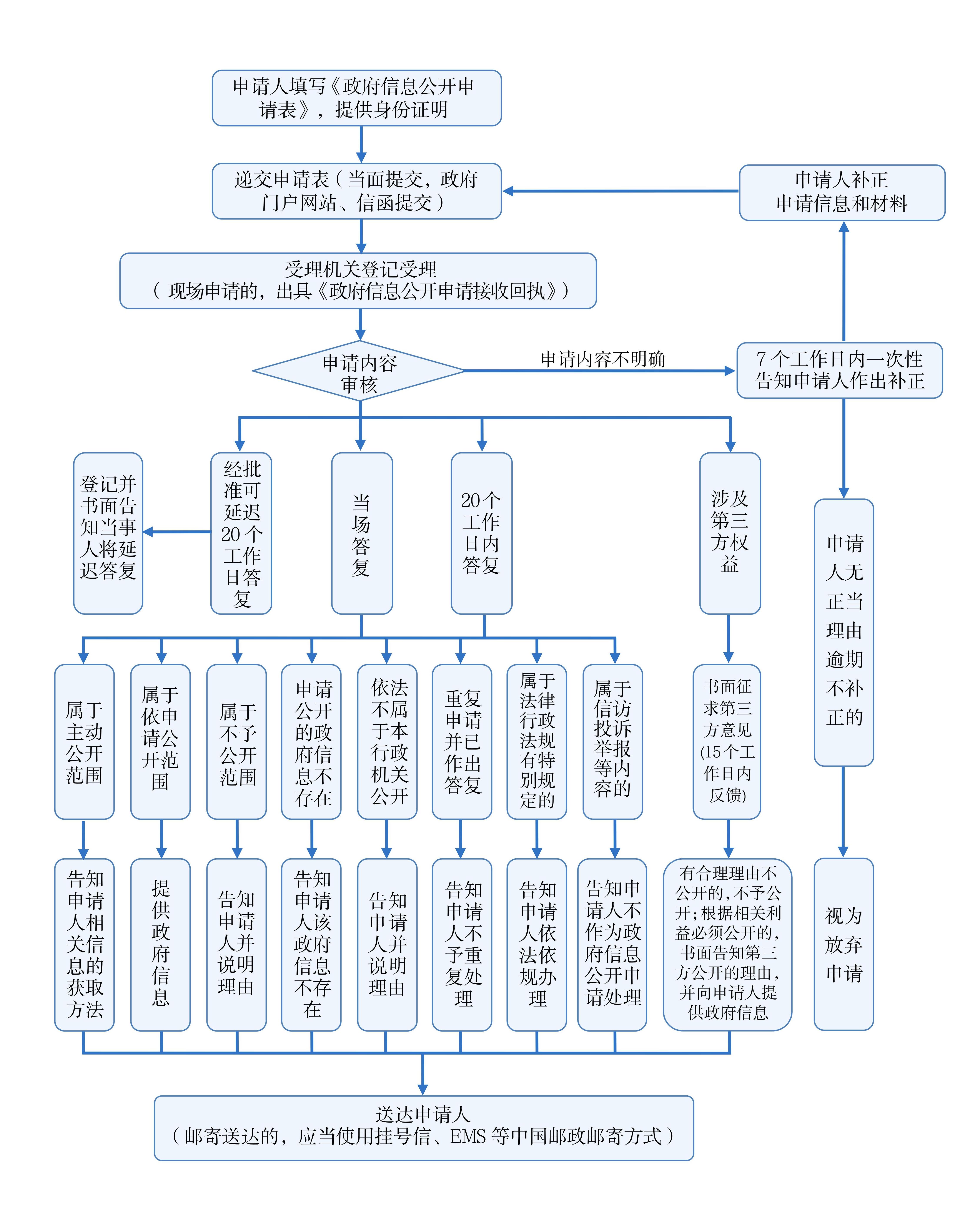 (1)申請(qǐng)人所提申請(qǐng)內(nèi)容不明確或者申請(qǐng)不符合規(guī)定要求的,應(yīng)當(dāng)自收到申請(qǐng)之日起7個(gè)工作日內(nèi)一次性告知申請(qǐng)人作出補(bǔ)正,說明需要補(bǔ)正的事項(xiàng)和合理的補(bǔ)正期限(申請(qǐng)人補(bǔ)正時(shí)間為10個(gè)工作日)。答復(fù)期限自行政機(jī)關(guān)收到補(bǔ)正的申請(qǐng)之日起計(jì)算。申請(qǐng)人無正當(dāng)理由逾期不補(bǔ)正的,視為放棄申請(qǐng),本機(jī)關(guān)不再處理該政府信息公開申請(qǐng)。