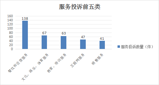 服務(wù)類投訴533件,占投訴總量17.2%,其中,投訴量居前五位的分別是:餐飲和住宿服務(wù)138件,文化、娛樂、體育服務(wù)67件,教育、培訓服務(wù)63件,互聯(lián)網(wǎng)服務(wù)47件,銷售服務(wù)41件。