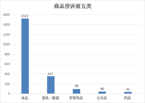 商品類投訴2569件,占投訴總量82.8%,其中,投訴量居前五位的分別是:食品1522件,服裝、鞋帽357件,家居用品99件,化妝品48件,藥品41件。