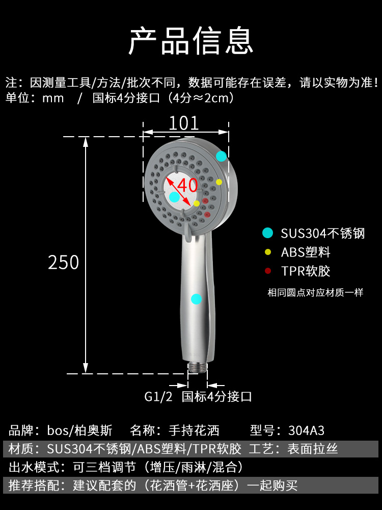 三檔調節/SUS304不銹鋼增壓花灑/可拆洗